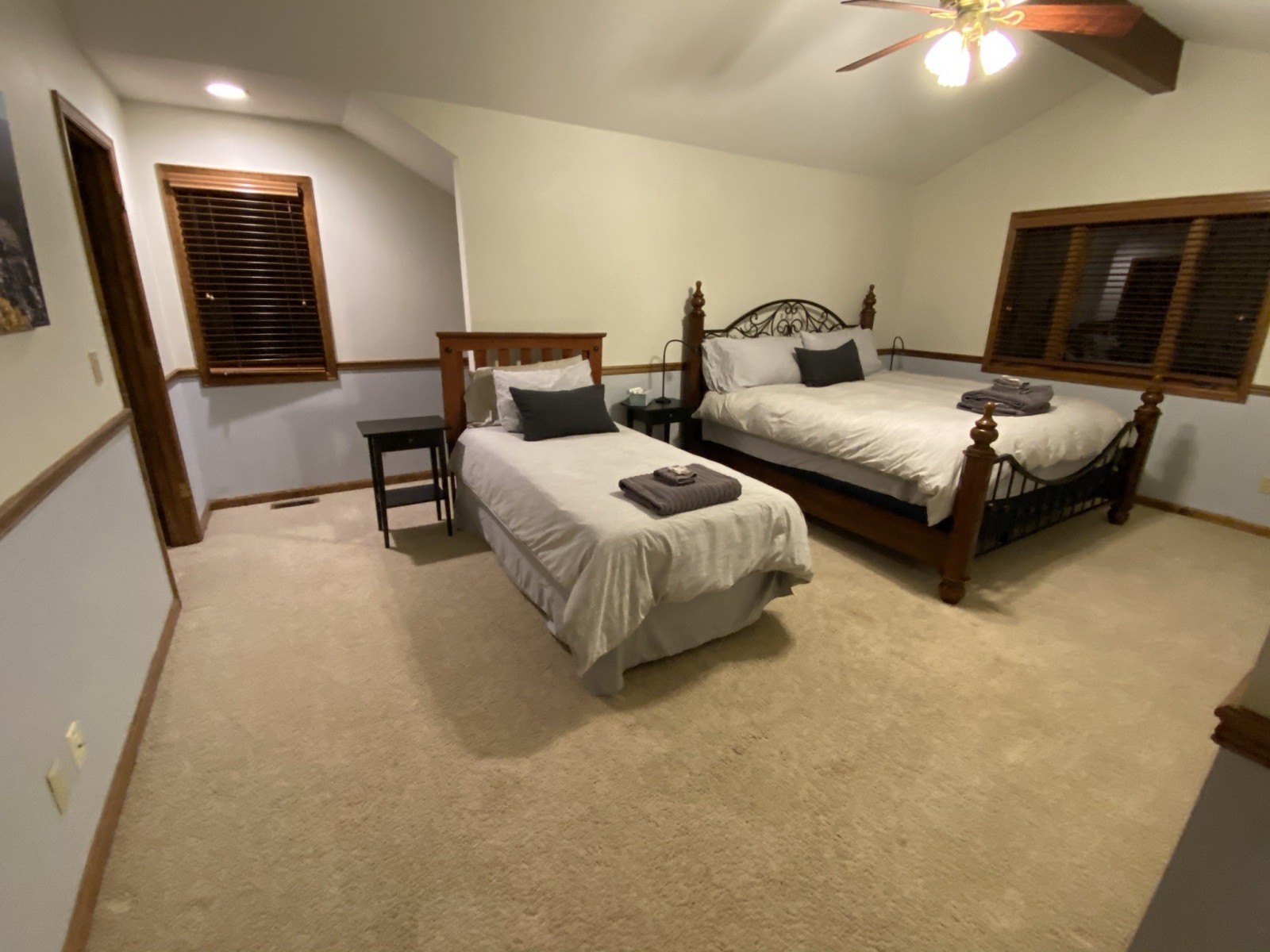 There are (4) twin beds in one upstairs bedroom and (1) twin and (1) king bed in the second upstairs bedroom. There is (1) king bed in the main floor master and (2) twin beds in the basement bedroom.