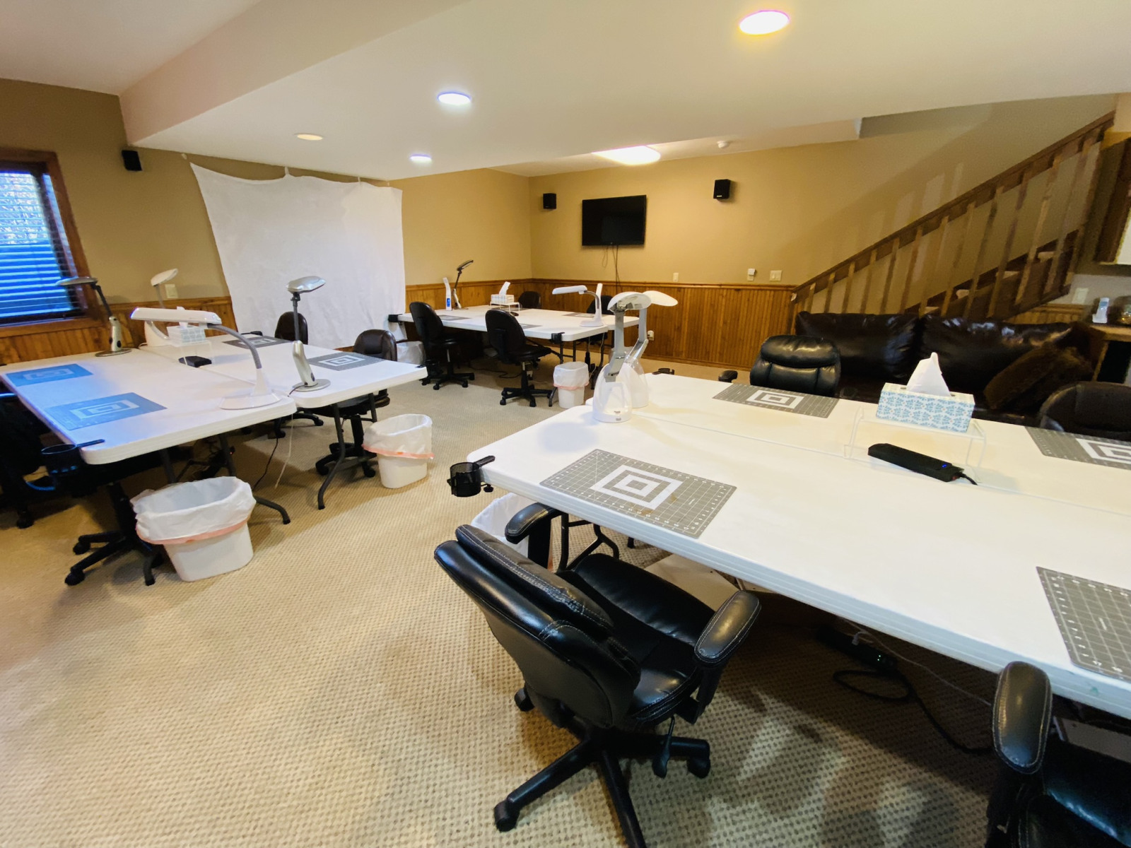 Come enjoy a weekend crafting in our workshop space! The basement workshop area offers crafters four feet of table space equipped with an Ottlite lamp for intricate detail work and padded chair on wheels. Each station has a large waste container, a self-healing mat and a drink holder. Once you set up your belongings, they can stay out the entire weekend!